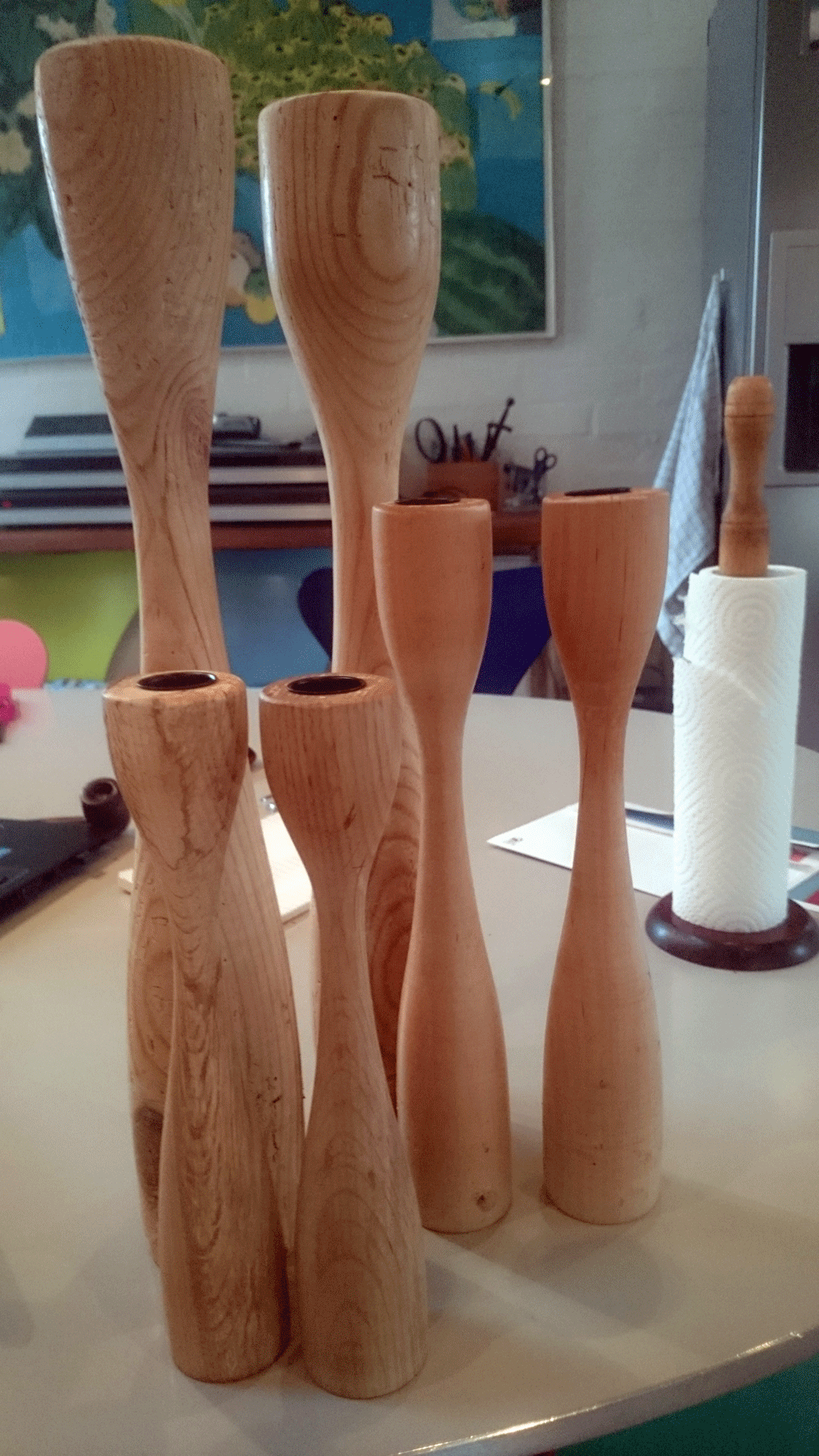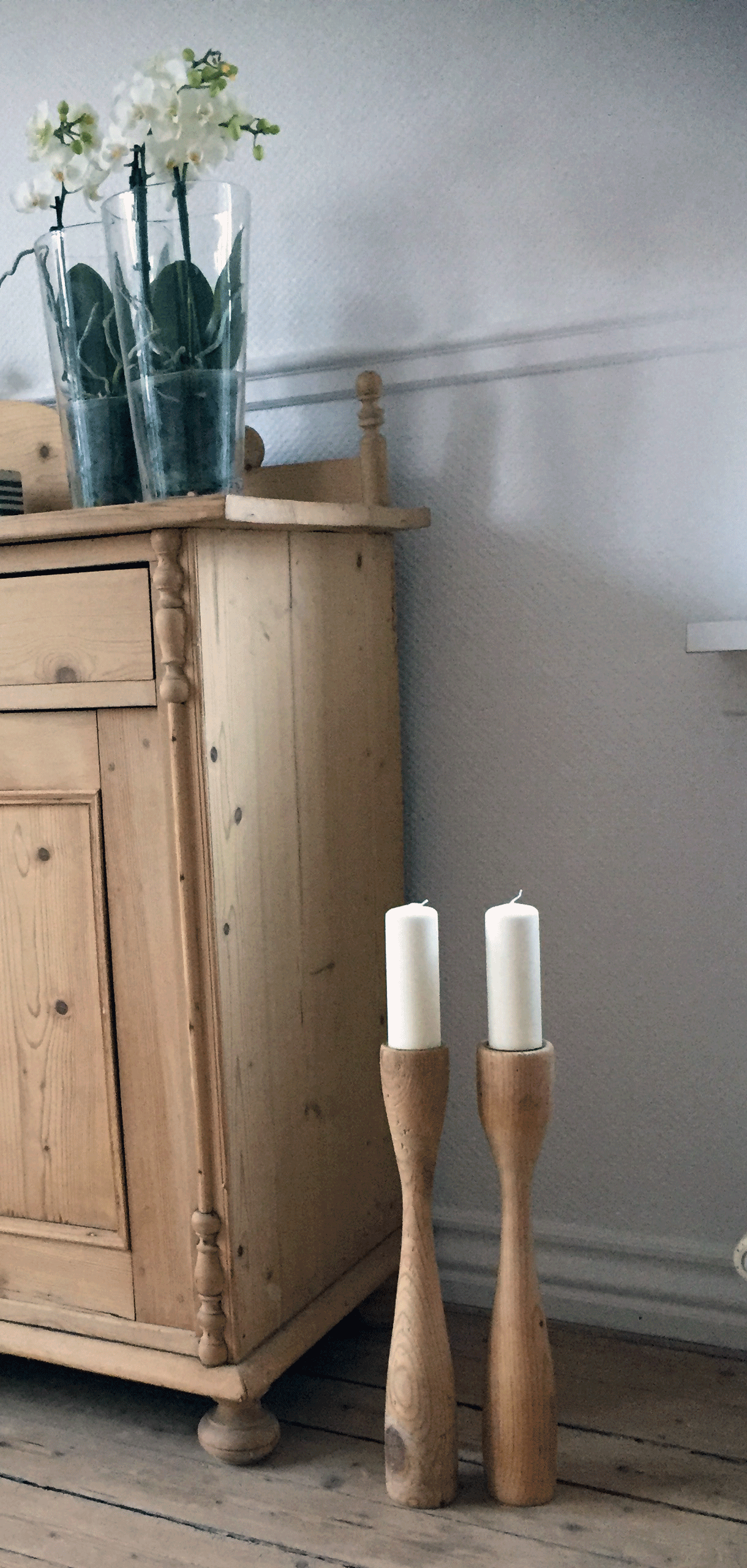 Når der er et par gamle frønnede rundstokke til overs kan de blive til flotte lysestager. Her passer de godt til en afsyret skænk.